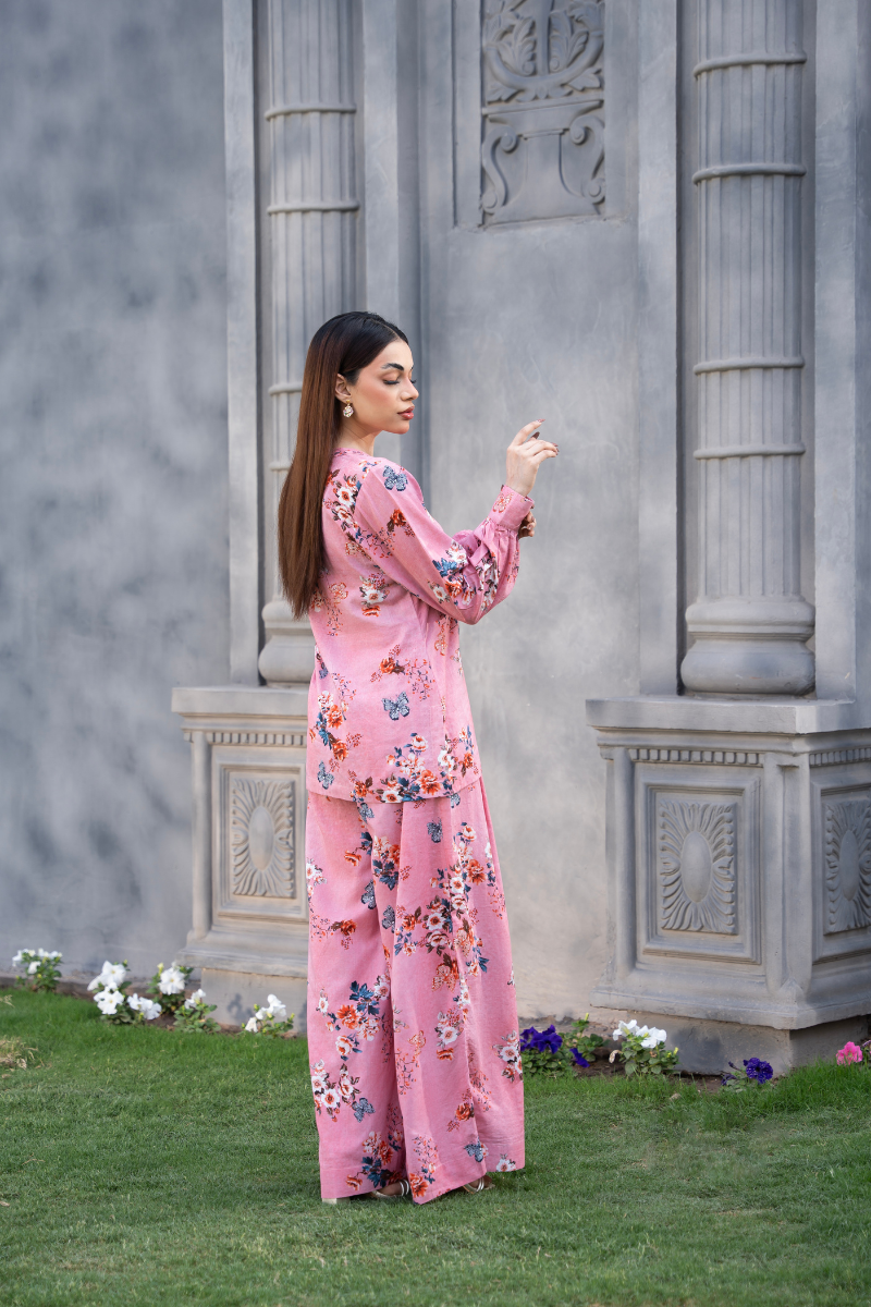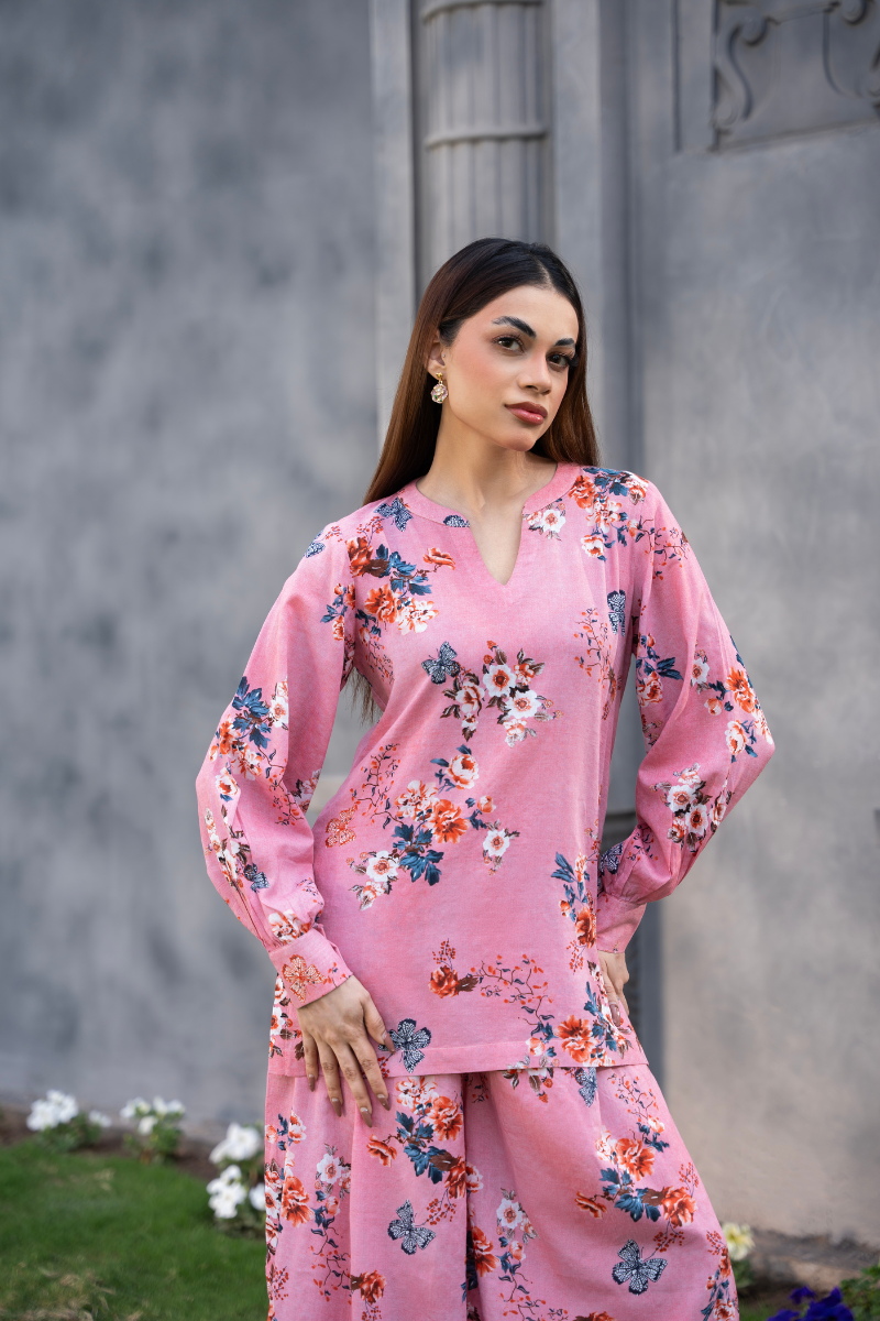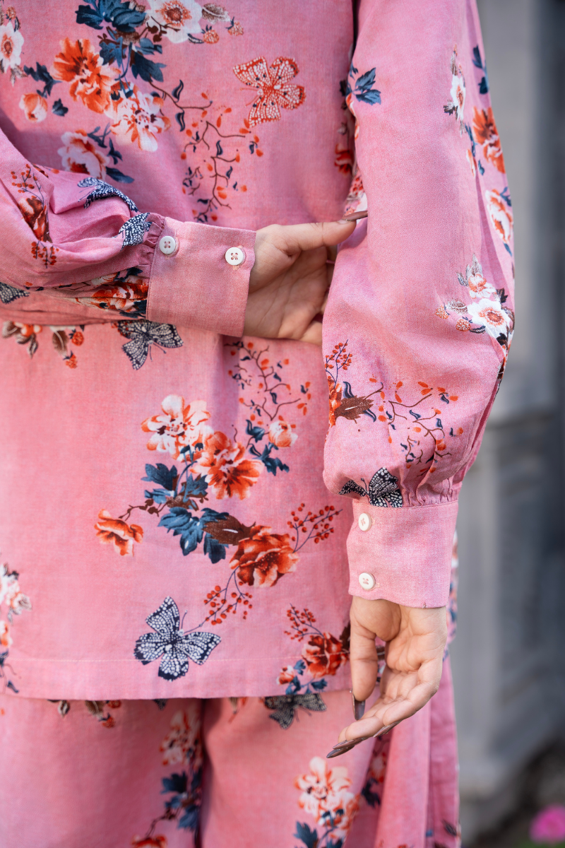 The Blush Muse Set is an ode to effortless femininity — where soft color meets blooming detail. Made from lightweight 100% cotton, this two-piece ensemble features a blush pink base sprinkled with artistic floral prints in soft tones. The V-cut neckline, flowy sleeves, and wide-leg pants bring an easy elegance to this relaxed silhouette. Whether worn together or styled as separates, this set captures comfort, charm, and everyday beauty — making it the perfect muse for any season.