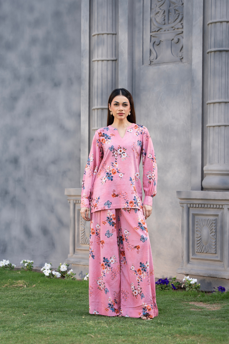 Two-piece floral co-ord set in blush pink featuring a V-neck tunic and wide-leg pants with soft multicolored floral print.