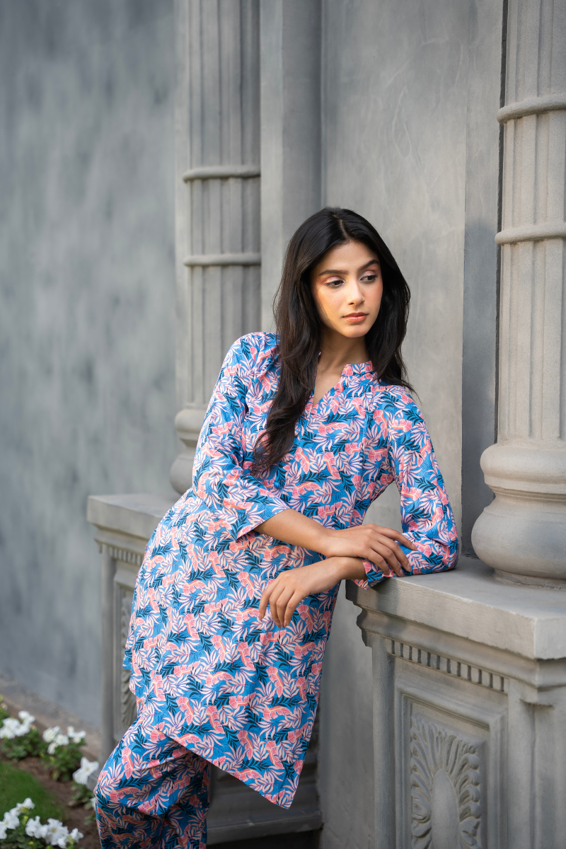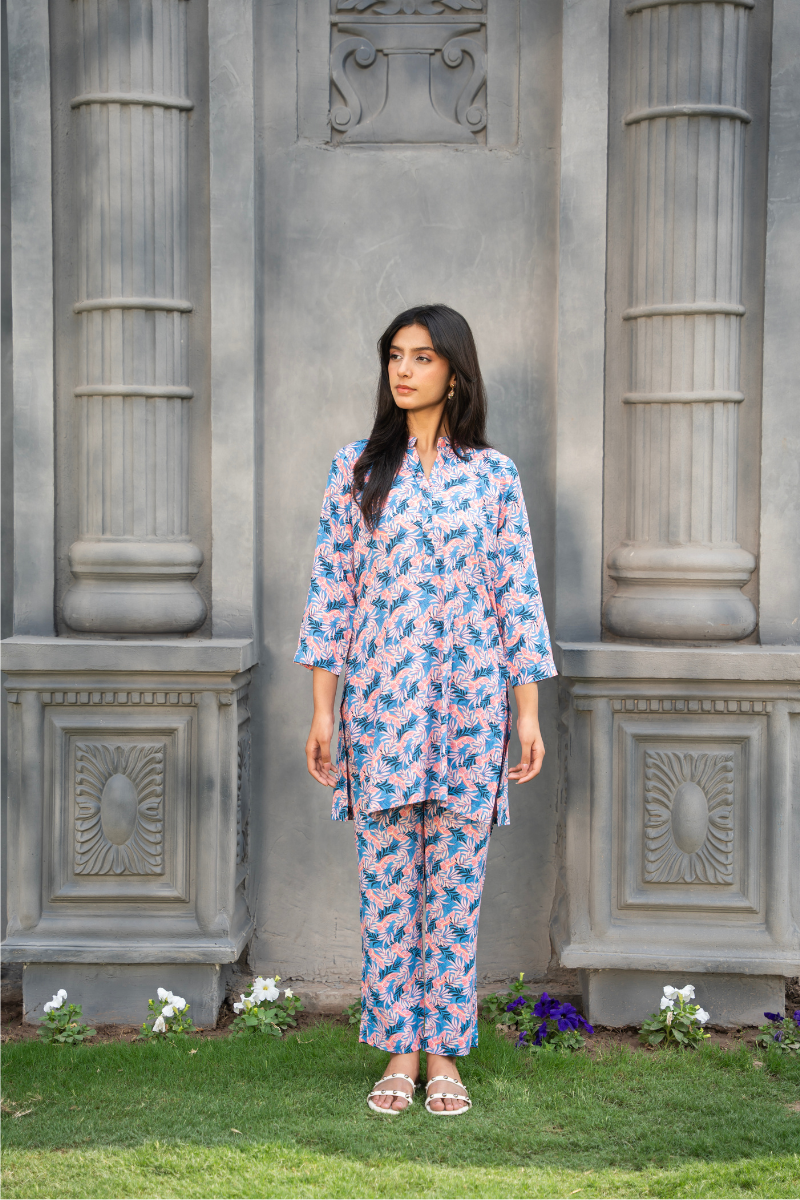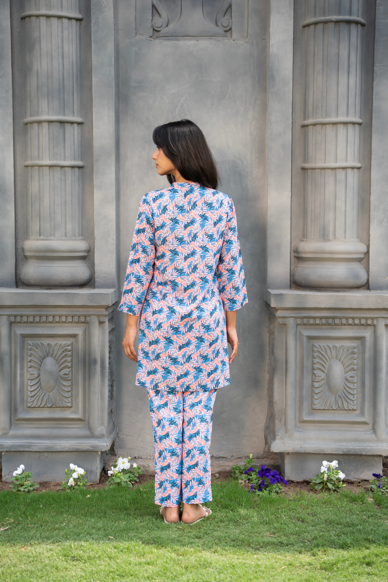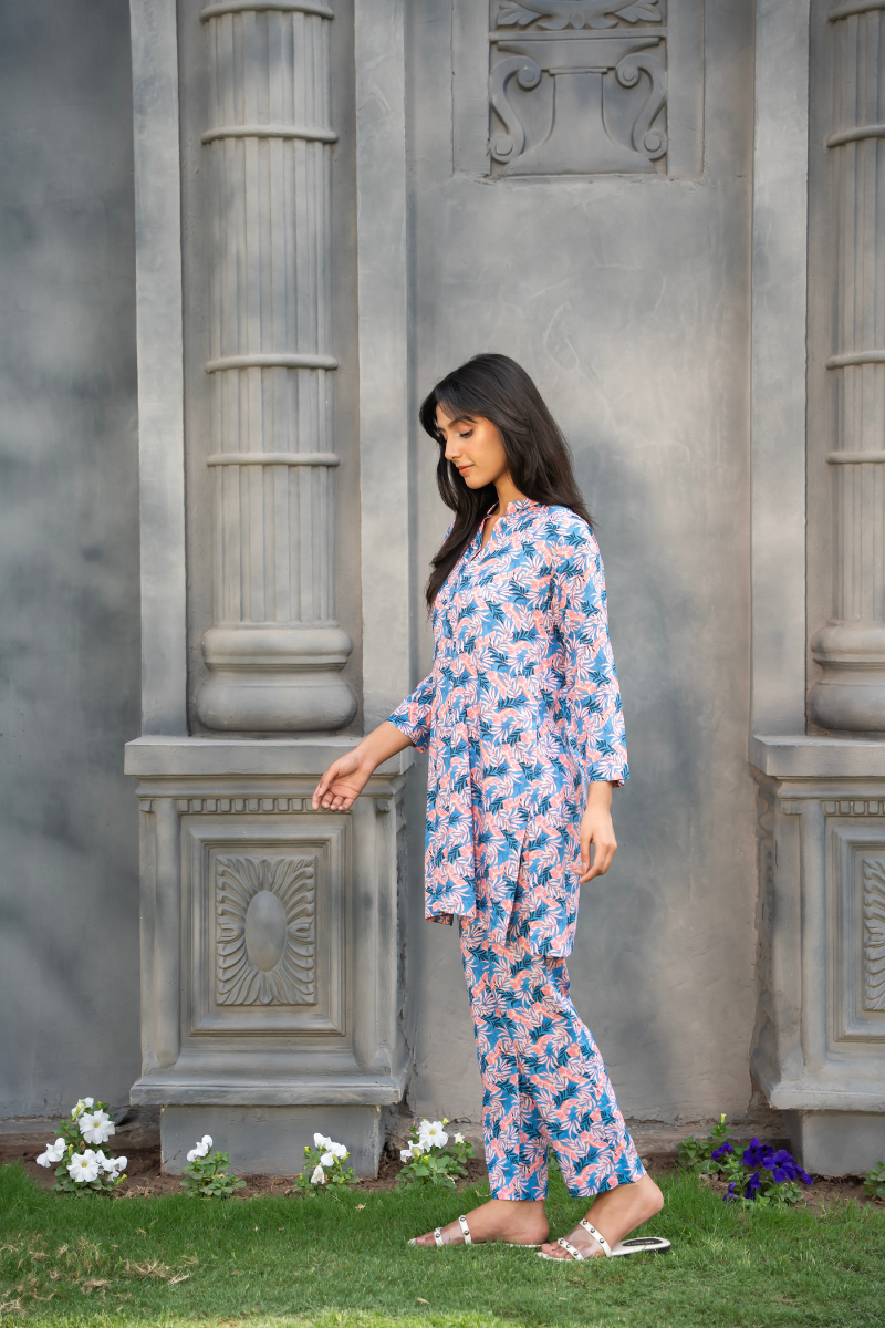 This printed co-ord set captures effortless everyday elegance with a fresh, feminine touch. Crafted in a breathable fabric, it features a soothing floral print in soft blue and pink tones that feel light and summery.