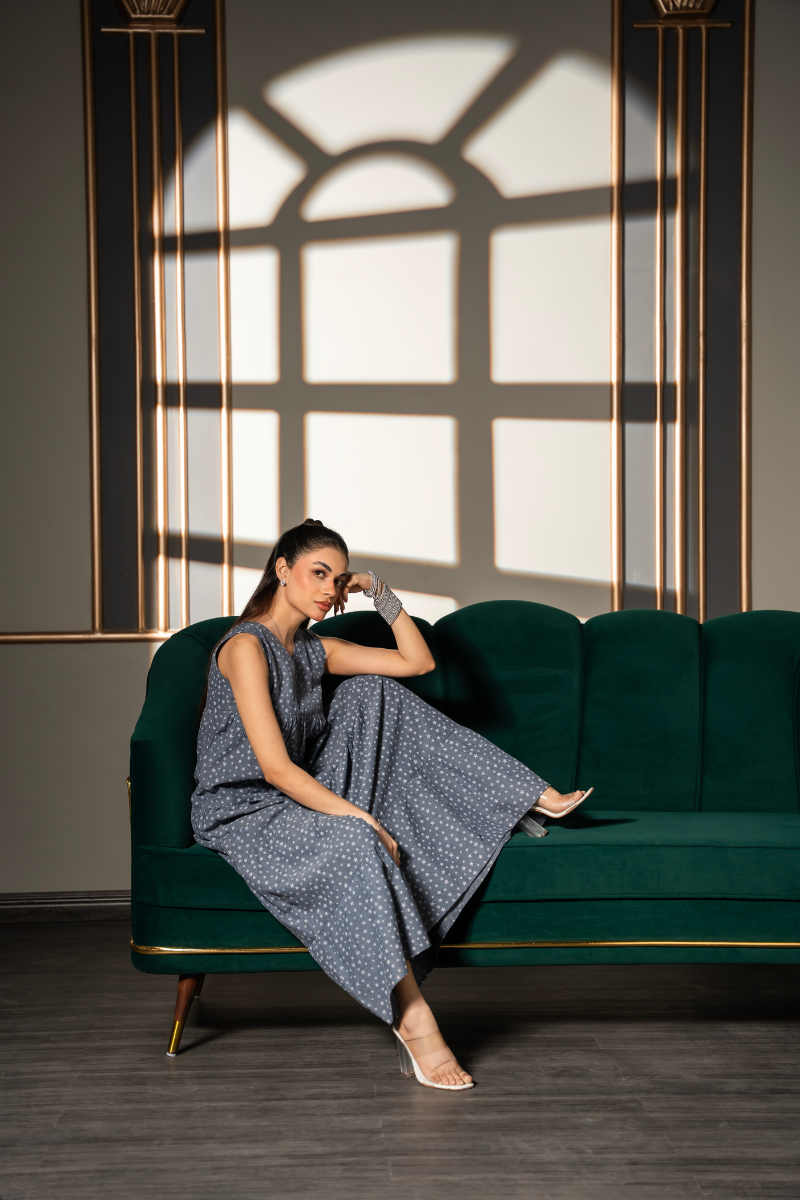 Feel celestial in the Starfall Tier Dress – a dreamy, lightweight dress adorned with a delicate star print that mimics the night sky in motion. Crafted from soft chambray with a gentle grey hue, this full-length tiered dress flows effortlessly with each step. The signature notched V neckline in the front and rounded back give it a refined, easygoing charm perfect for daytime outings or relaxed evenings. A balance of whimsy and elegance, this piece belongs in every modern muse’s wardrobe.