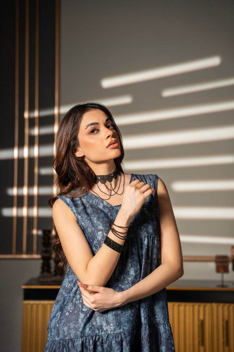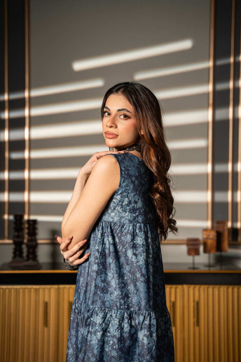 The Twilight Tier Dress is where gentle structure meets poetic detail. Crafted from breathable denim chambray in a deep twilight blue, this full-length tiered dress flows effortlessly with a graceful, easy silhouette. The notched V neckline adds clean structure, while the soft floral-washed print creates an air of understated romance. Ideal for transitional days, weekend brunches, or barefoot evenings, this dress embodies quiet charm with elevated ease.