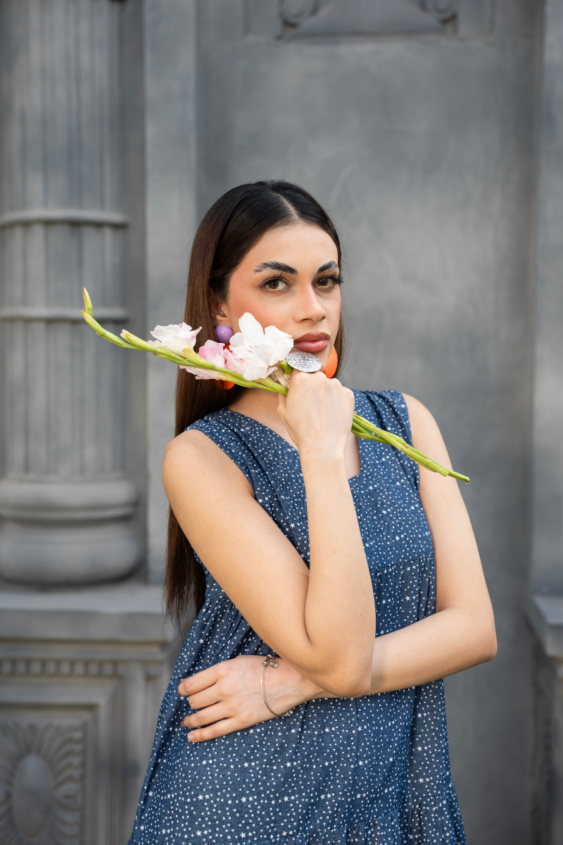 Soft as a sigh and delicate as a daydream, the Whisper Dot Tier Dress brings timeless grace to your everyday wardrobe. Crafted from airy cotton chambray, it flows gently through a relaxed four-tier silhouette with dainty ivory polka dots that feel both playful and polished. The front features a notched V neckline for subtle structure, while the back softens into a rounded shape — making it a perfect blend of charm and comfort. Ideal for slow mornings, evening strolls, or laid-back gatherings.