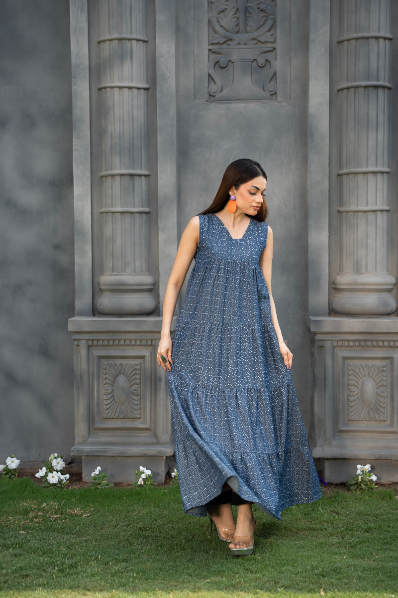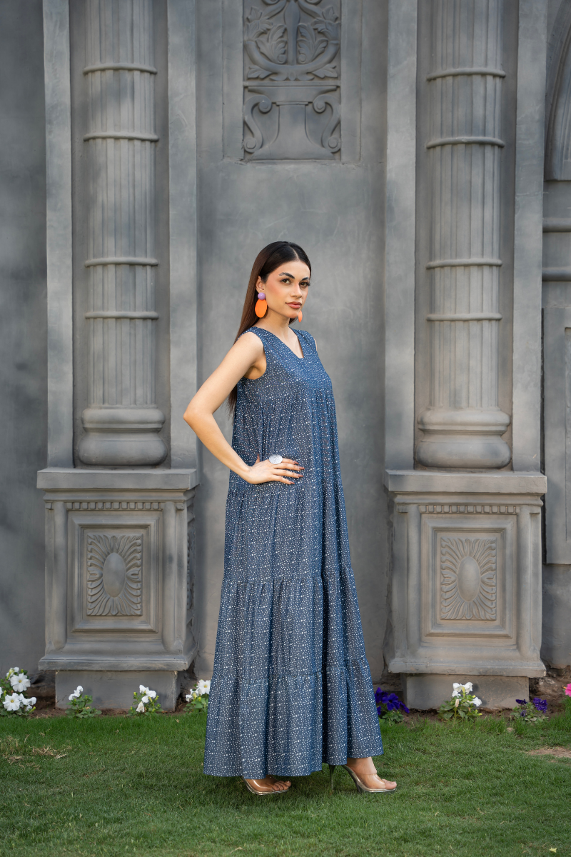 Sleeveless full-length chambray dress with ivory polka dot print, featuring a notched V neckline, rounded back, and four-tiered silhouette for soft volume and movement.